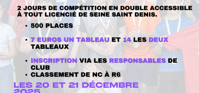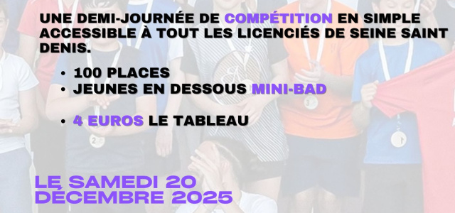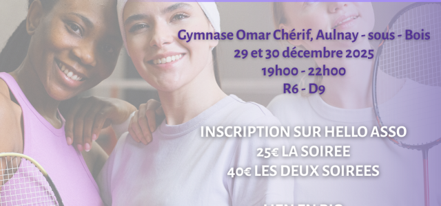 Le Comité Départemental de Badminton 93 vous invite à un stage exclusivement réservé aux joueuses ! Deux soirées d’entraînement intensif pour progresser, se dépasser et partager un moment sportif entre femmes passionnées. 📍 Lieu : Gymnase Omar Chérif – Aulnay-sous-Bois📅 Dates : 29 & 30 décembre 2025⏰…